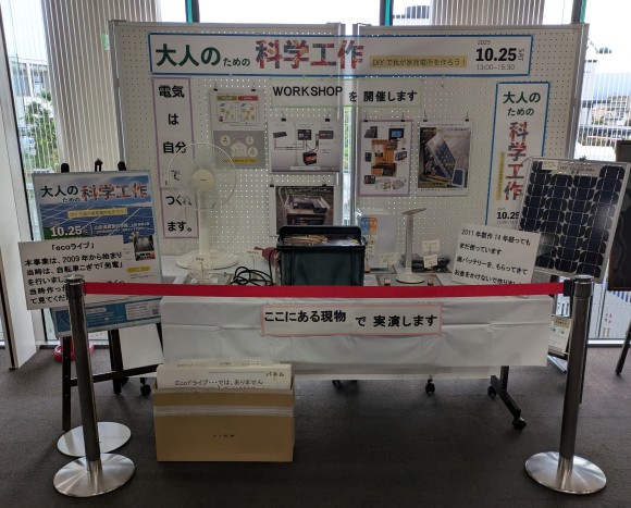 本日から、10月25日(土)開催予定のワークショプ「大人のための科学工作」~DIYで我が家発電所をつくろう!~のモデル展示としまして、手作り蓄電装置の展示をはじめました。場所は2階「科学道100選」隣のスペースとなっております。多くの方にご覧いただければ幸いです。
