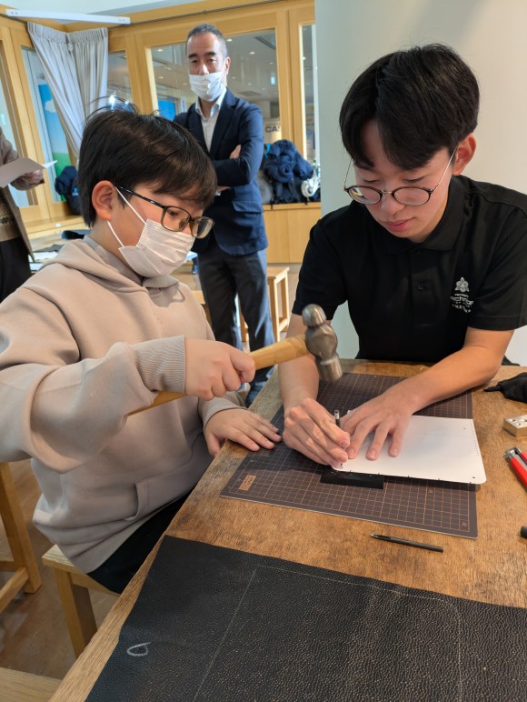 皮革製品の端材を利用した小物入れの製作を親子で体験していただきました