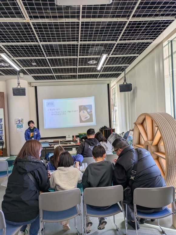 2階フリースペースでは、サイエンスショー「水素は未来のエネルギー」と「ぷよぷよ芳香剤をつくろう」そして4階発明工房では、「のび~るスライム」と「光るスライム」つくりを実施中